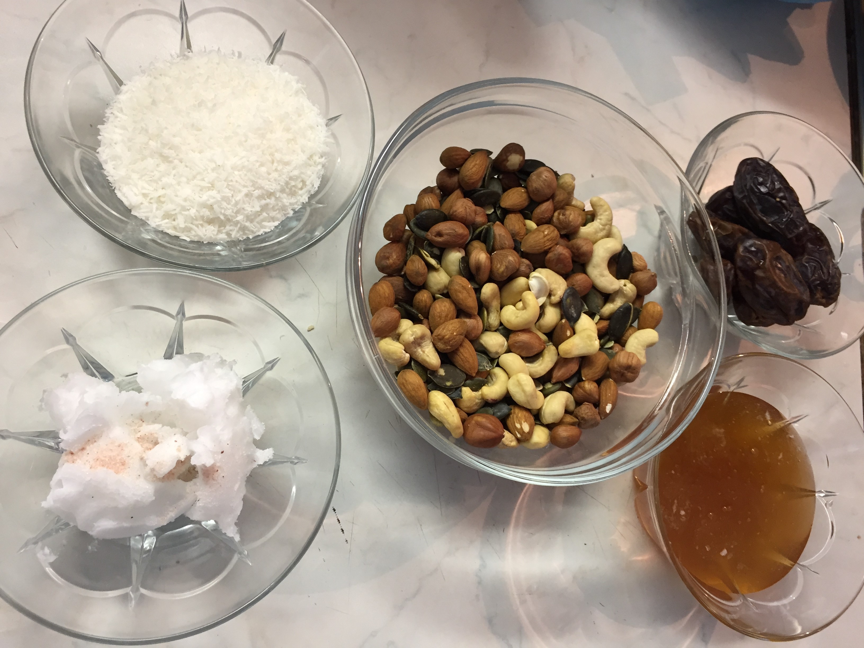 4. U zdjelu istresti usitnjene orašaste plodove, dodati kokosovo brašno, sol i cimet.Sve preliti medom i kokosovim uljem i dobro izmiješati.
