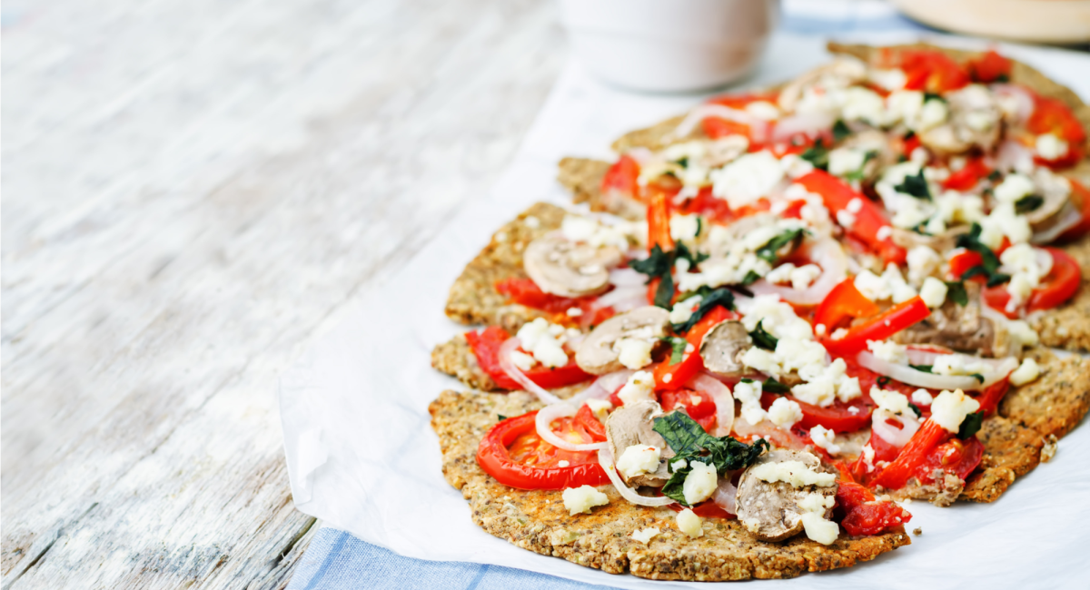 Sjemenke suncokreta usitniti u blenderu dok ne dobijete brašno, dodajte bademovo brašno, sol i origano. U vodu dodati chia sjemenke i ostaviti ih da odstoje 15 minuta. Nakon 15 minuta nabubrene chia sjemenke dodajte suhim sastojcima i formirajte tijesto. Na pleh stavite papir za pečenje, oblikujte tijesto promjera oko 25 cm te ga na par mjesta izbodite vilicom. Pećnicu zagrijte na 180° C i tijesto pecite 20-tak minuta. Zatim izvadite tijesto iz pećnice te posložite nadjev niže navedenim redoslijedom: