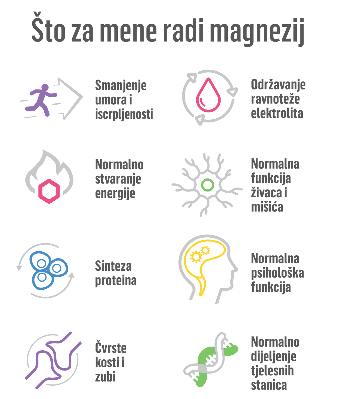 Nijedna stanica tijela ne može preživjeti bez magnezija i sve žive stanice na zemlji trebaju magnezij. Magnezij je uključen u stotine procesa u tijelu. Svi trebamo magnezij za rast, ravnotežu kalcija u tijelu, pretvorbu hrane koju jedemo u životnu energiju, za životne procese koji se kontinuirano odvijaju u tijelu poput prijenosa živčanih impulsa, kontrakciju i opuštanje mišića, proizvodnju proteina. Magnezij ove uloge ostvaruje uglavnom kroz aktivaciju različitih enzima, a kao elektrolit ima važnu ulogu u održavanju ravnoteže tekućine u tijelu.