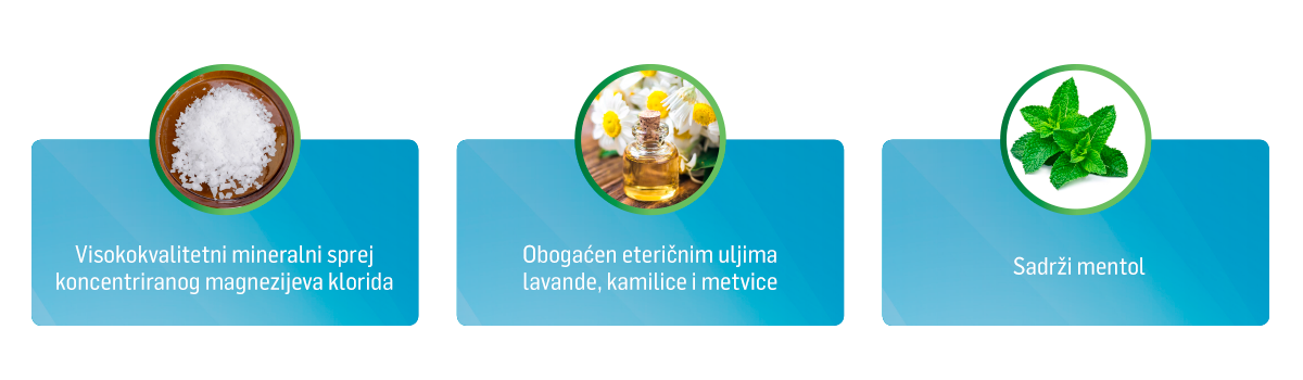 Magnezij Sport sprej je visokokvalitetni mineralni sprej koncentriranog magnezijeva klorida, za direktnu primjenu na koži. Pogodan je za masažu mišića nakon sportskih napora, kao i za sportsku masažu napetih mišića. Specijalna kombinacija magnezija, mentola i eteričnih ulja, umasirana u kožu tijela, ima opuštajući učinak i pruža trenutno olakšanje umornim mišićima. Formula istovremeno hladi, osvježava i njeguje kožu, a može se koristiti više puta dnevno.
