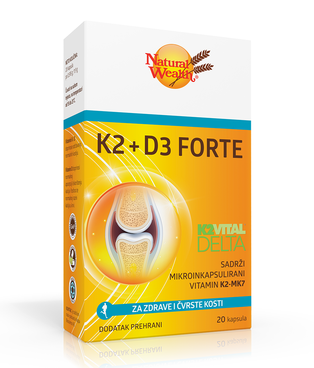 Natural Wealth® K2 + D3 Forte sadrži K2VITAL® DELTA, mikroinkapsulirani vitamin K2 MK-7, zaštićen dvostrukom ovojnicom, što osigurava maksimalnu stabilnost i punu snagu tijekom cijelog roka valjanosti. Pakiranje sadrži 20 kapsula, a uzima se jedna kapsula dnevno.