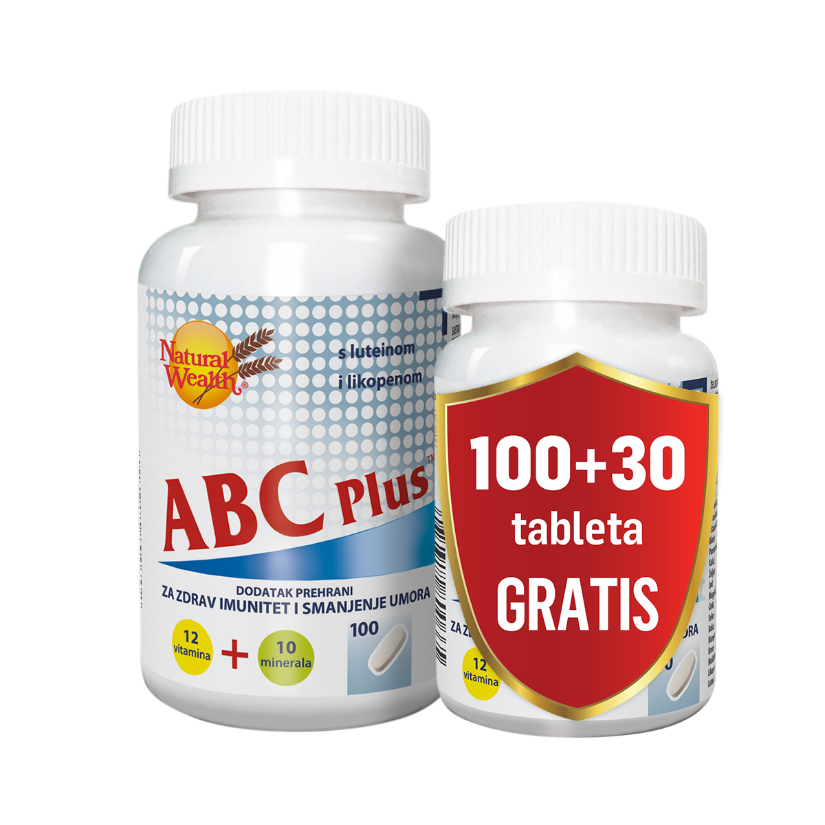 Natural Wealth® ABC Plus™ dobro je izbalansiran multivitaminsko-mineralni proizvod: sadrži 12 vitamina, 10 minerala, lutein i likopen. Preporučuje se za očuvanje zdravog imuniteta i smanjenje umora, kao dodatak prehrani pri svakodnevnim aktivnostima te svima koji žele svakodnevno osigurati optimalan unos neophodnih mikronutrijenata. Željezo, vitamini C, B6 i B12 samo su neki od sastojaka ABC Plusa™ koji doprinose smanjenju umora i iscrpljenosti te normalnoj funkciji imunološkog sustava. Bez glutena, mlijeka/mliječnih proizvoda, šećera, umjetnih boja, aroma i konzervansa.