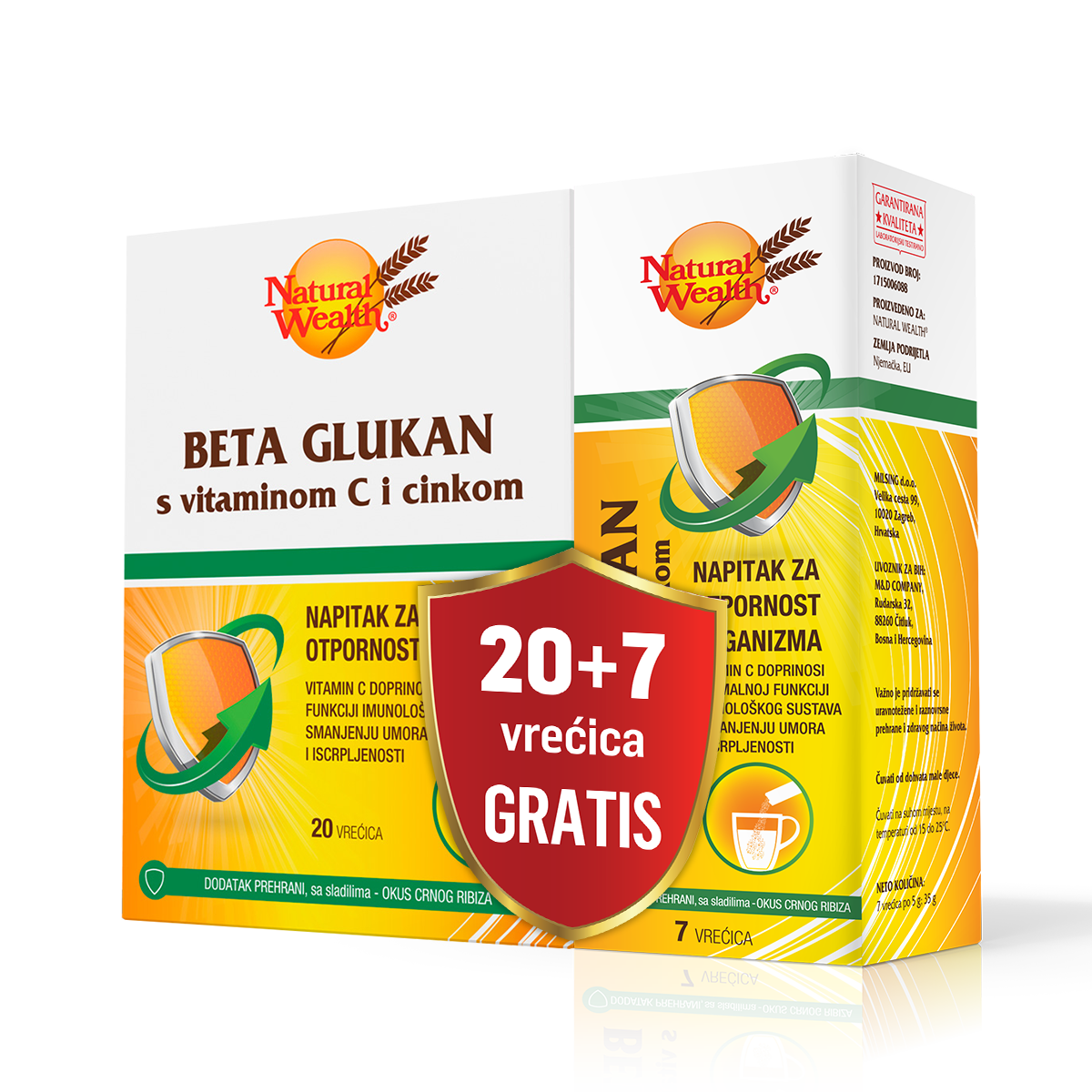 Natural Wealth® Beta glukan s vitaminom C i cinkom je izvrstan i praktičan napitak za zaštitu imuniteta koji se može pripremiti kao okrepljujući vrući ili osvježavajući hladni napitak, s dodanim medom i okusom crnog ribiza. Bez glutena, laktoze i mlijeka. Vitamin C doprinosi normalnoj funkciji imunološkog sustava te smanjenju umora i iscrpljenosti.