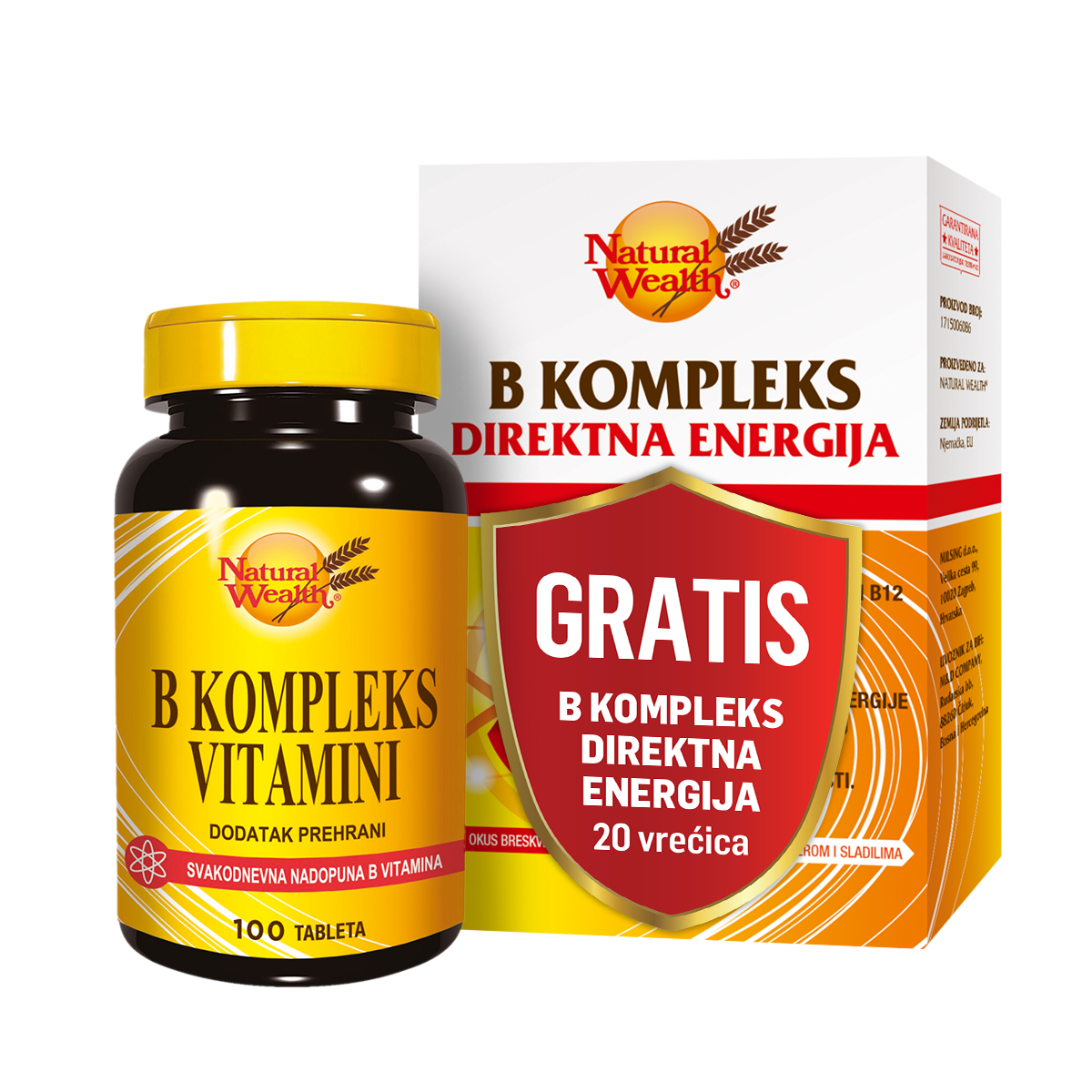 Natural Wealth® B kompleks vitamini sadrže vitamine B skupine čija je svakodnevna zastupljenost u hrani važna jer ih urinom brzo gubimo iz organizma. Vitamini B2, B6 i B12 doprinose normalnom metabolizmu stvaranja energije, normalnoj funkciji živčanog sustava te smanjenju umora i iscrpljenosti. Folat doprinosi normalnoj funkciji imunološkog sustava. Vitamin B1 doprinosi normalnoj funkciji srca i normalnom funkcioniranju živčanog sustava.