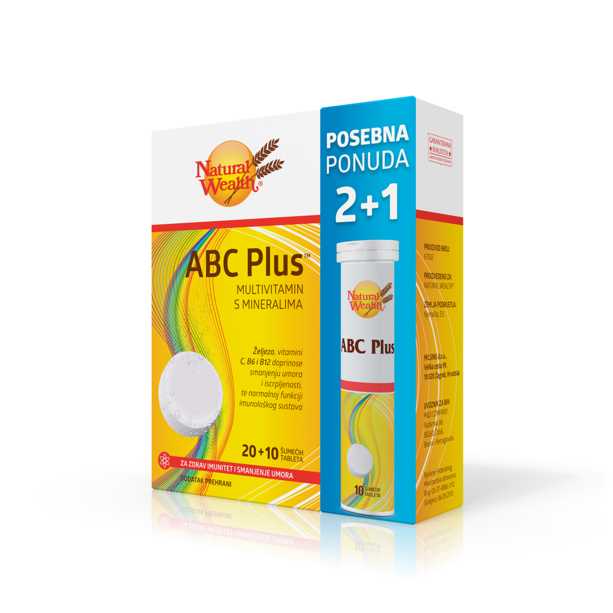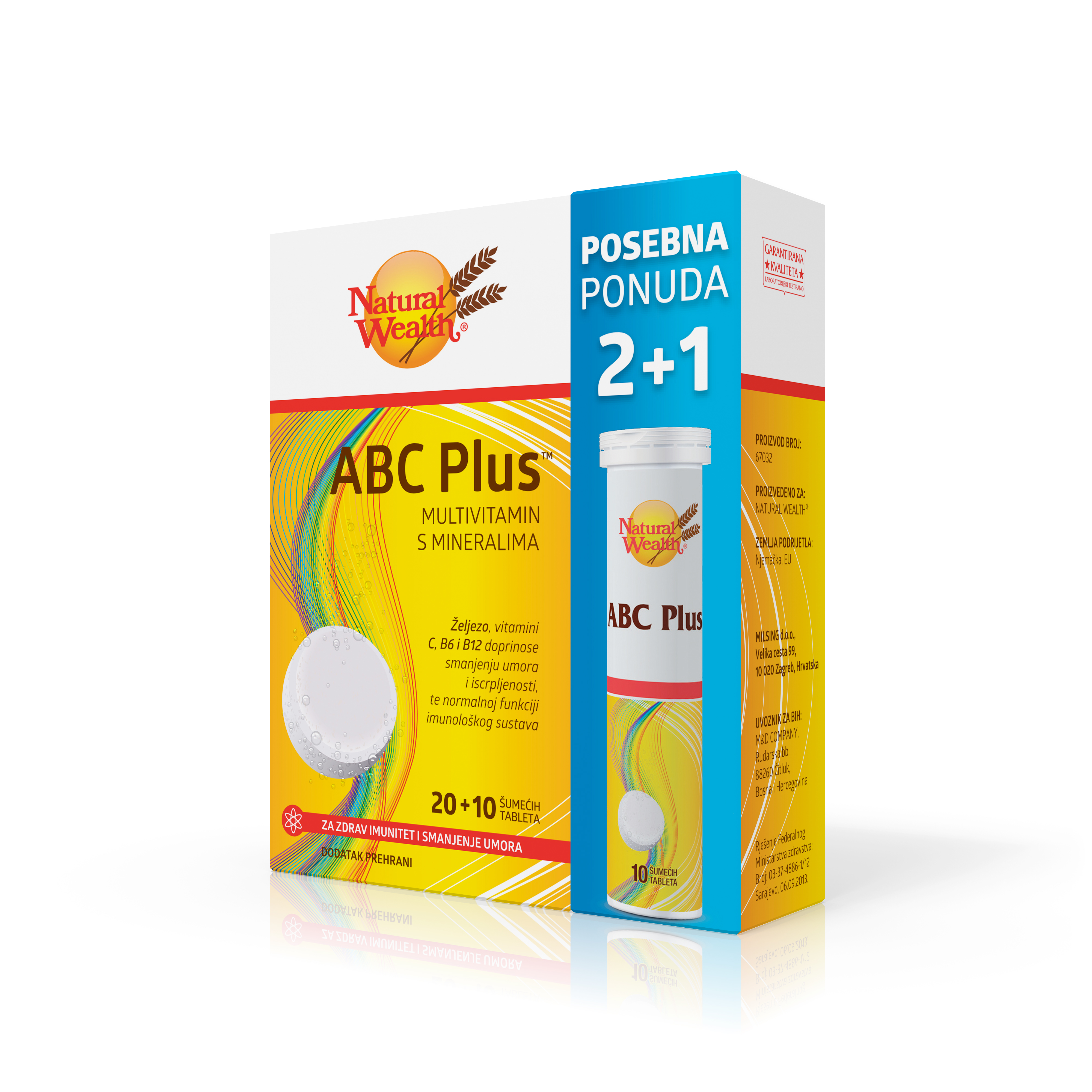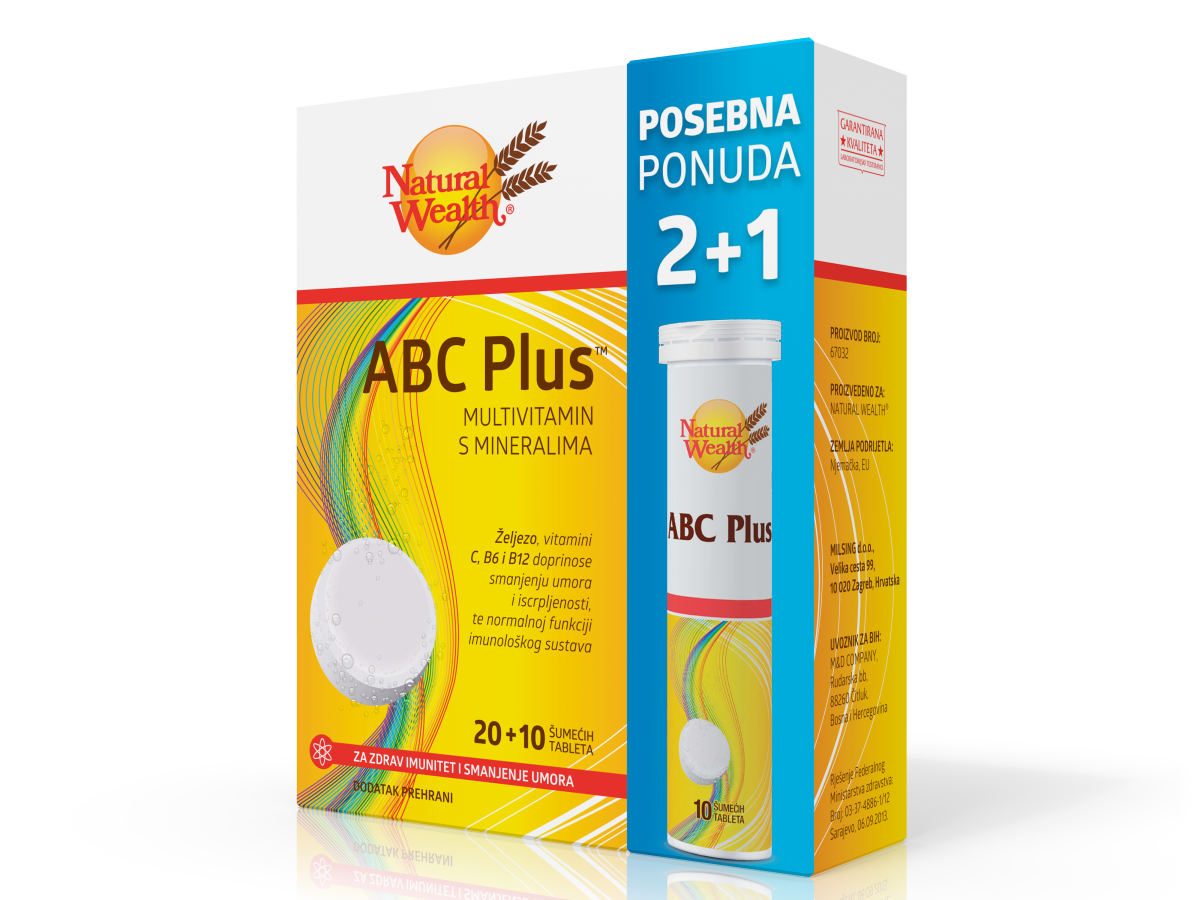 Natural Wealth® ABC Plus™ dobro je izbalansiran multivitaminsko-mineralni proizvod: sadrži 12 vitamina i 10 minerala i ugodnog je okusa naranče. Preporučuje se za očuvanje zdravog imuniteta i smanjenje umora, kao dodatak prehrani pri svakodnevnim aktivnostima te svima koji žele svakodnevno osigurati optimalan unos neophodnih mikronutrijenata. Željezo, vitamini C, B6 i B12 samo su neki od sastojaka ABC Plusa™ koji doprinose smanjenju umora i iscrpljenosti te normalnoj funkciji imunološkog sustava.
