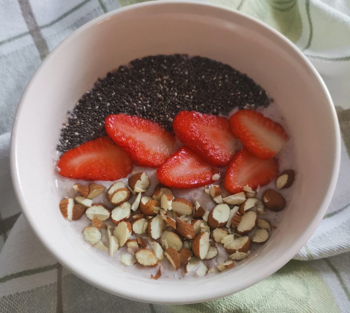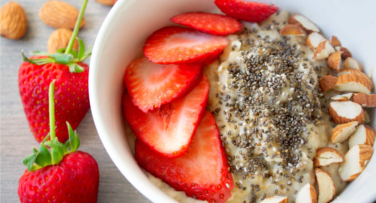 Pahuljice i 2/3 chia sjemenki prelijte mlijekom i ostavite da nabubre. Dodati Kolagen Vital, med, ukrasiti jagodama, bademima i ostatkom chia sjemenki.